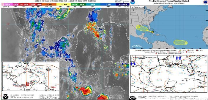 Golfo de México: Cielo parcialmente nublado durante la mañana, incremento de nublados por la tarde con lluvias puntuales fuertes en Veracruz e intervalos de chubascos en Tamaulipas y Tabasco, todas con descargas eléctricas y posibles granizadas. Ambiente caluroso. Viento del este de 10 a 25 km/h y rachas de hasta 50 km/h en Tamaulipas.