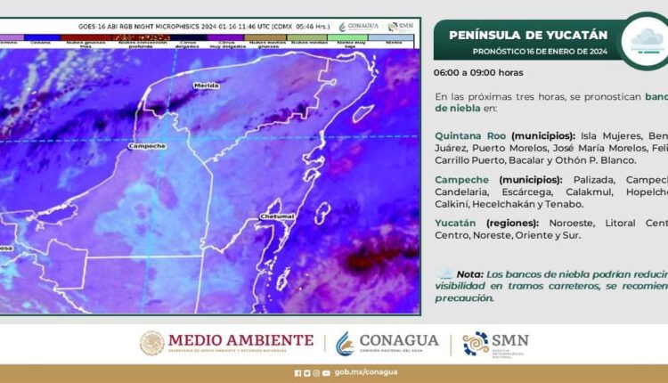 Para las próximas horas se pronostican bancos de niebla para los municipios de Isla Mujeres, Benito Juárez, Puerto Morelos, José María Morelos, Felipe Carrillo Puerto, Bacalar y Othón P Blanco.