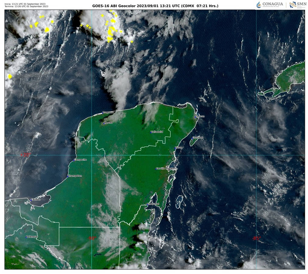 Cielo medio nublado a nublado con intervalos de chubascos en Yucatán y Quintana Roo, así como lluvias fuertes en Campeche, las cuales, podrían reducir la visibilidad e incrementar los niveles de ríos y arroyos, producir deslaves (Campeche), y encharcamientos en Quintana Roo y Yucatán.
