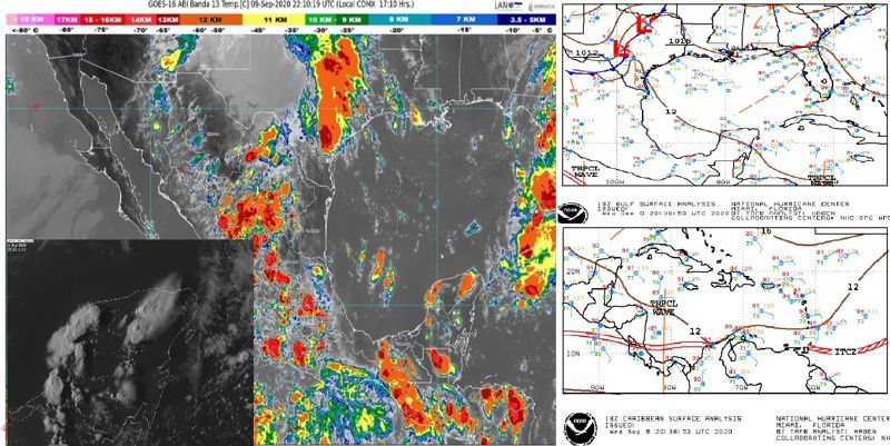 Por la tarde, canales de baja presión en interacción con el ingreso de humedad proveniente del Océano Pacífico y con divergencia en la atmósfera superior, generarán lluvias puntuales fuertes a intensas acompañadas de descargas eléctricas y posibles granizadas en zonas del noroeste, occidente, centro y sureste de la República Mexicana. Una nueva onda tropical se aproximará al sur de la Península de Yucatán e incrementará la probabilidad de lluvias en dicha región.