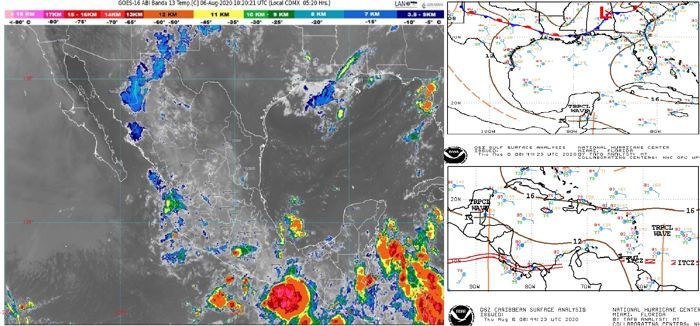 Para hoy, la onda tropical No. 25 recorrerá la península de Yucatán y el sureste del país, generando lluvias puntuales intensas en Campeche, Oaxaca y Chiapas, muy fuertes en el sur de Veracruz, Tabasco y Yucatán, así como lluvias fuertes en Quintana Roo, precipitaciones acompañadas de descargas eléctricas y rachas de viento.