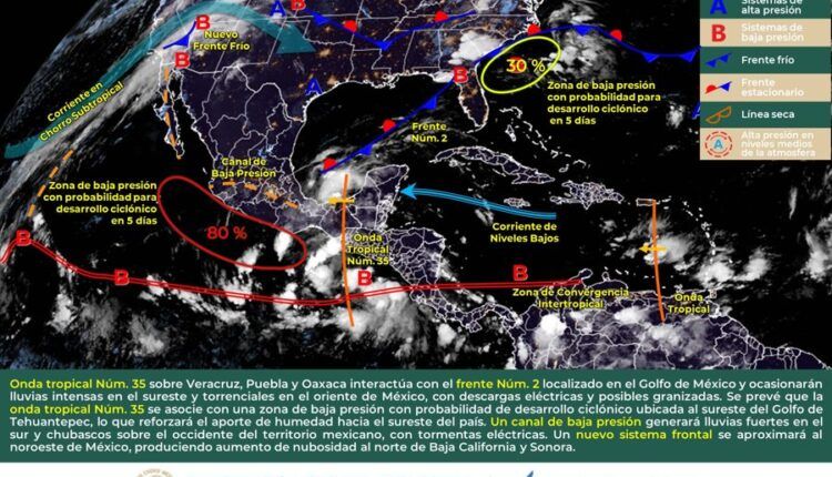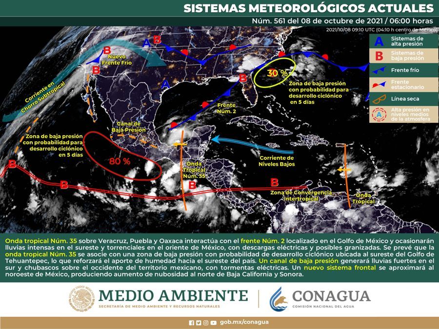 Para hoy, se pronostica que la onda tropical Núm. 35 se desplace sobre Veracruz, Puebla y Oaxaca, y que interactúe con el frente Núm. 2 que se localizará sobre el Golfo de México, ocasionando lluvias intensas en el sureste y torrenciales en el oriente de México, acompañadas de descargas eléctricas y posibles granizadas, las cuales podrían generar incremento en los niveles de ríos y arroyos, deslaves e inundaciones.