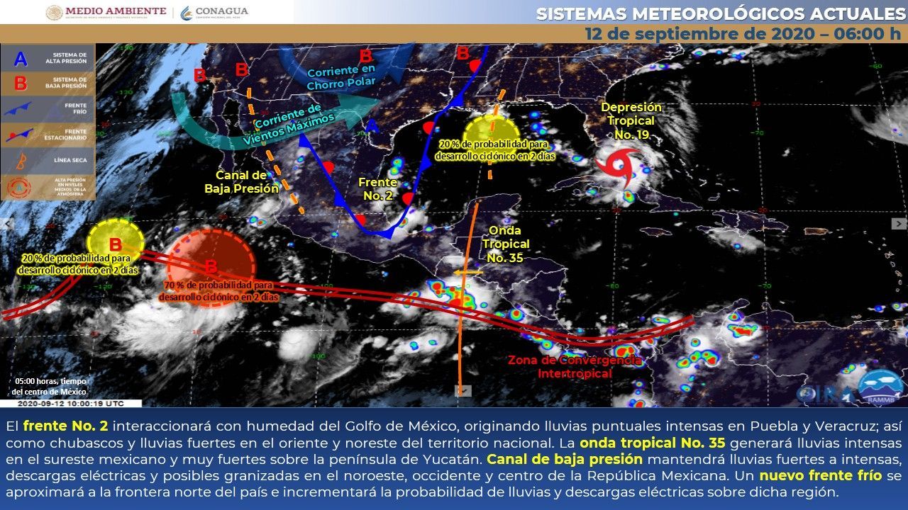 La onda tropical No. 35 avanzará lentamente al sur de la Península de Yucatán, generando lluvias intensas en el sureste mexicano y muy fuertes sobre dicha península. Canal de baja presión mantendrá lluvias fuertes a intensas, acompañadas de descargas eléctricas y posibles granizadas en el noroeste, occidente y centro de la República Mexicana. Finalmente, un nuevo frente frío se aproximará a la frontera norte del país e incrementará la probabilidad de lluvias acompañadas de descargas eléctricas sobre dicha región.