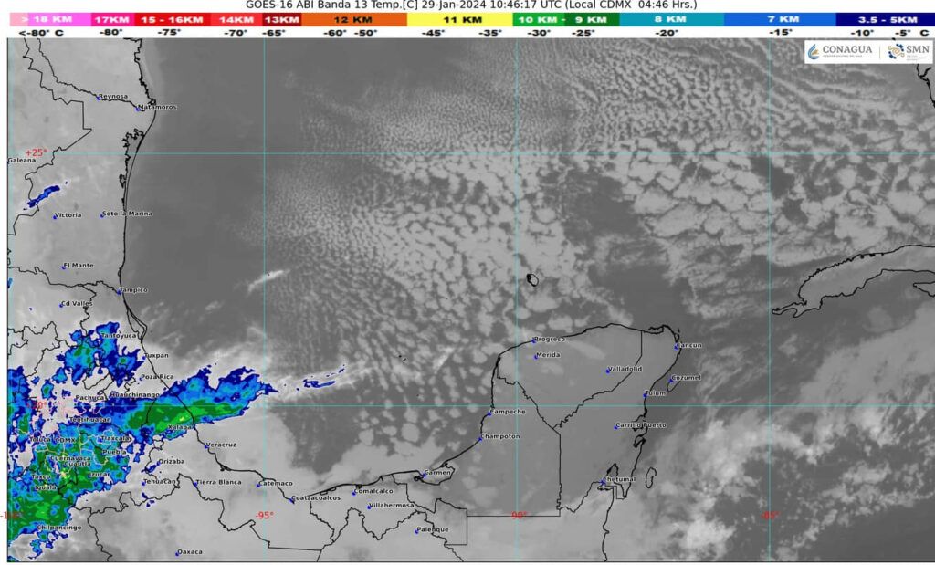 Cielo medio nublado a nublado con lluvias aisladas en zonas de Campeche, Yucatán y Quintana Roo. Ambiente fresco por la mañana y templado a cálido por la tarde, siendo caluroso en zonas de Campeche. Evento de “Norte” con rachas de 40 a 60 km/h y oleaje de 1 a 3 metros de altura en costas de Campeche, Yucatán y Quintana Roo.