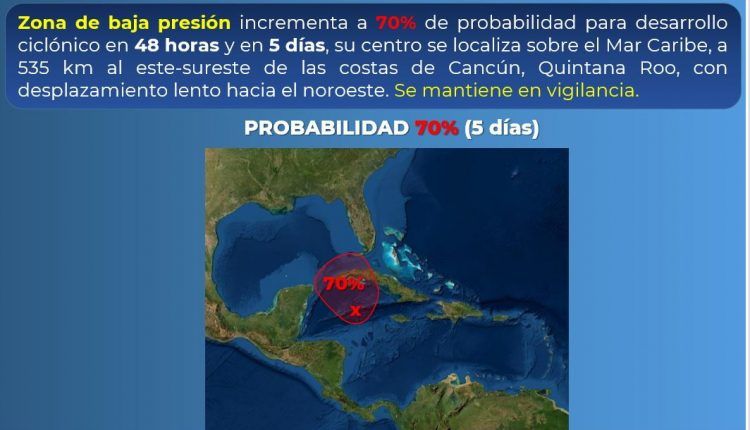 Una Zona de Baja Presión en el mar Caribe con 70% de probabilidad para desarrollo ciclónico en 48 horas, se localiza a 535 km al este sureste de #Cancún, QuintanaRoo, informó esta tarde la Coordinación Estatal de Protección Civil de Quintana Roo por medio de su suenta de Twitter.