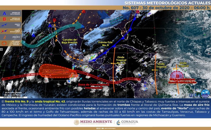 Este día, el frente frío No. 9 interaccionará gradualmente con la onda tropical No. 43 frente a las costas de Quintana Roo, generando lluvias puntuales torrenciales en el norte de Chiapas y Tabasco; muy fuertes a puntuales intensas en el sureste de México y la Península de Yucatán; también existen condiciones para la formación de trombas frente al litoral de Quintana Roo.