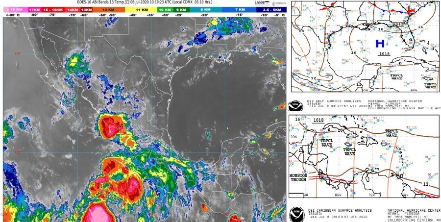 Para la Península de Yucatán se pronostica cielo parcialmente nublado con incremento de nubosidad por la tarde e intervalos de chubascos en Campeche y Yucatán, así como lluvias aisladas en Quintana Roo, todas con descargas eléctricas. Ambiente caluroso y viento del sureste de 10 a 25 km/h en la región, además de rachas de 50 a 60 km/h en Campeche y Yucatán.