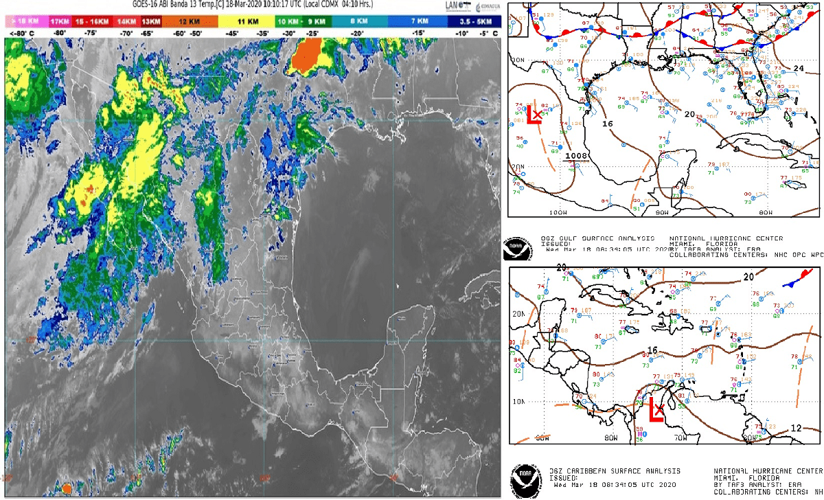 Península de Yucatán: Cielo despejado la mayor parte del día con incremento de nublados y lluvias aisladas por la tarde en Quintana Roo. Viento del este y noreste de 10 a 25 km/h con rachas de 60 a 70 km/h en las costas de Yucatán.