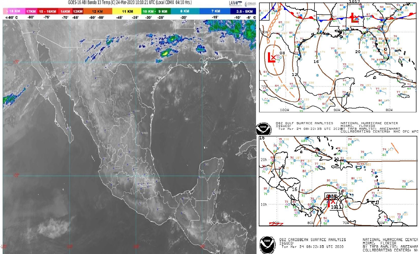 Golfo de México: Cielo despejado la mayor parte del día. Ambiente caluroso y viento del sur y sureste de 15 a 30 km/h con rachas de 60 a 70 km/h en Tamaulipas.