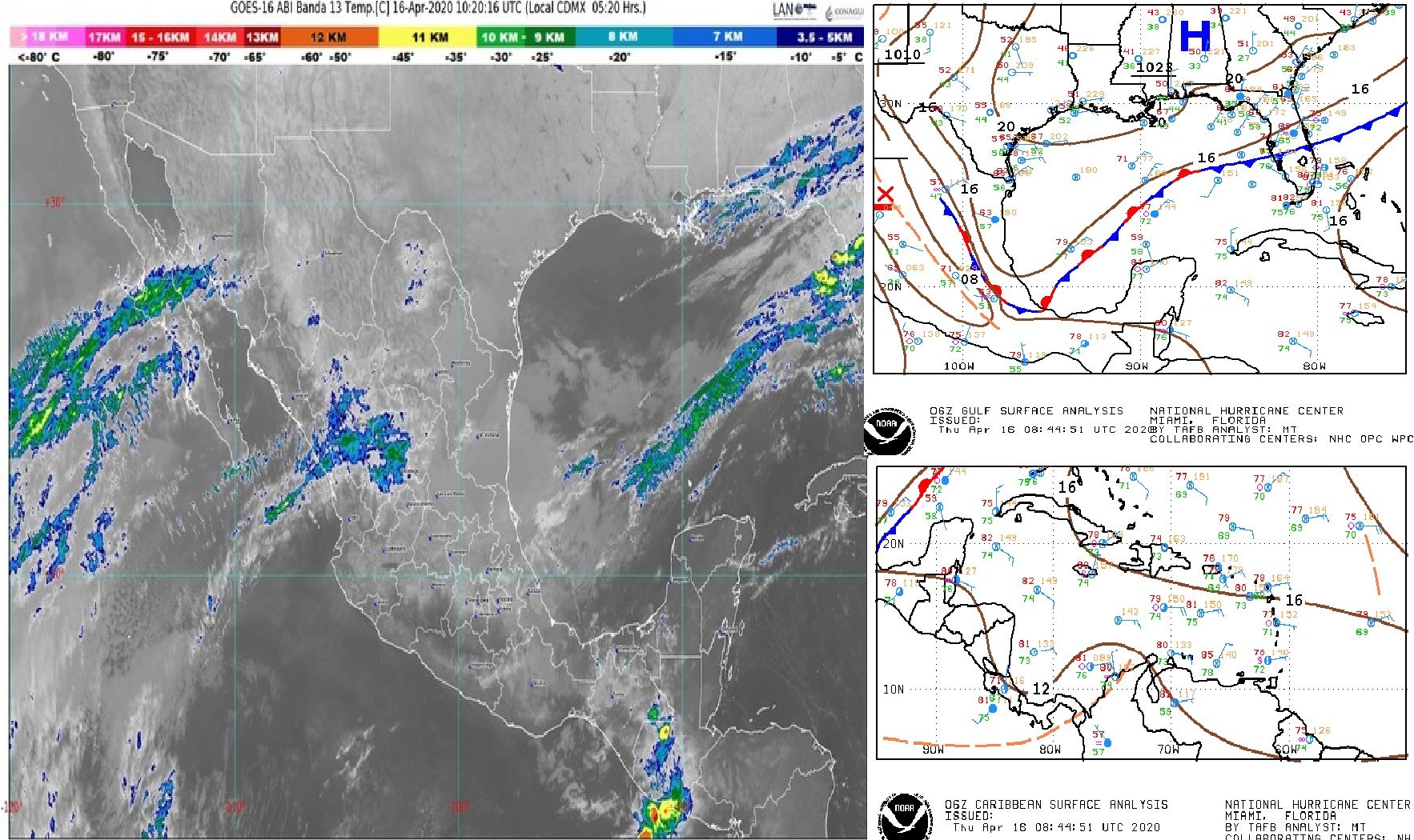 Para hoy, el frente No. 52 con características de estacionario, en interacción con un canal de baja presión, originarán chubascos sobre el noreste y oriente del país, con lluvias puntuales fuertes en el sureste del territorio, las cuales se acompañarán de descargas eléctricas y granizadas, además de densos bancos de niebla en el oriente y sureste de México. La masa de aire que impulsa al frente, se alejará y comenzará a modificar sus características en el transcurso del día. Una línea seca sobre Chihuahua, en interacción con la corriente en chorro, producirán vientos fuertes con rachas de 60 a 70 km/h y tolvaneras sobre entidades de la Mesa del Norte. En contraste, un sistema de alta presión en niveles medios de la atmósfera mantendrá una onda de calor y escaso potencial de lluvias sobre el centro y sur del territorio nacional, incluyendo la Península de Yucatán, con temperaturas superiores a 35 °C en 20 entidades del país.