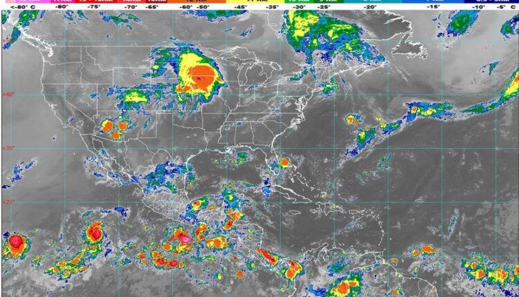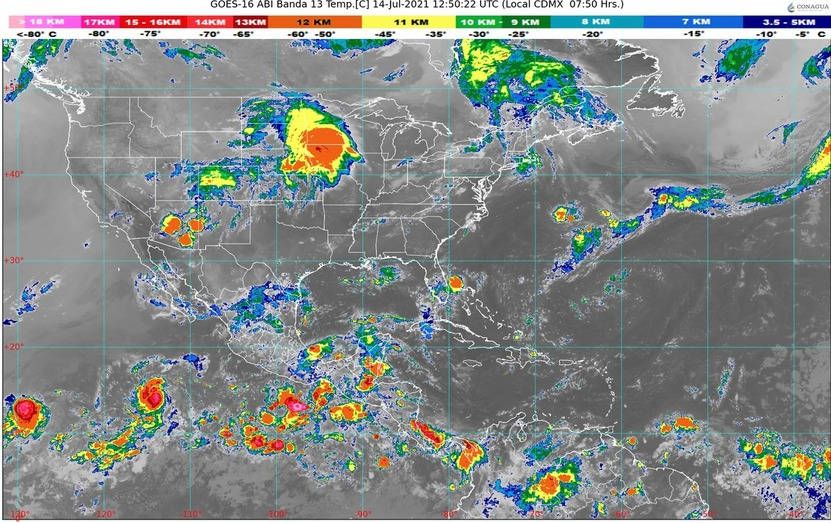 Para hoy, un canal de baja presión se extenderá desde el noroeste hasta el centro del país, interaccionará con la entrada de humedad proveniente del Océano Pacífico, con inestabilidad atmosférica superior y con el paso de la onda tropical Núm. 10 la cual se desplazará sobre el sur y occidente de México, ocasionando chubascos y lluvias puntuales fuertes las cuales se acompañarán de descargas eléctricas y posibles granizadas sobre los estados del noroeste, norte, occidente, centro y sur de México, con tormentas puntuales muy fuertes en Sonora, Guerrero y Puebla.