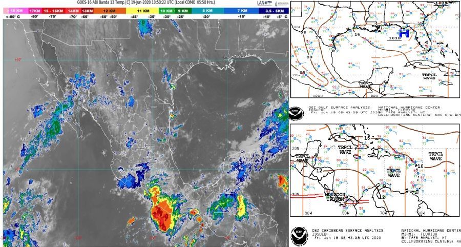 Para hoy, un canal de baja presión se extenderá sobre el interior del territorio nacional, en interacción con una línea seca en el norte de Coahuila y la entrada de humedad proveniente del Golfo de México, ocasionarán chubascos y lluvias puntuales fuertes, actividad eléctrica, rachas de viento al paso de las tormentas y posibles granizadas sobre entidades del norte, noreste y centro de la República Mexicana, con la posible formación de tornados en el norte de Coahuila.