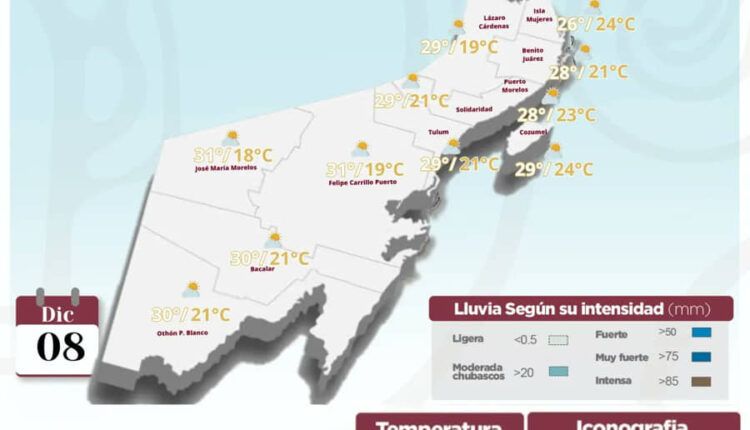 Se mantiene el sistema de alta presión localizado sobre el sureste de E.U.A., impulsa aire continental polar modificado sobre la Península de Yucatán y el Estado de Quintana Roo, y la entrada de humedad del Mar Caribe, mantendrán cielo parcialmente nublado a medio nublado durante el transcurso del día, lluvias dispersas y chubascos ocasionales sobre algunas zonas del Estado, las temperaturas serán calurosas durante el día y templadas a frescas por la noche y madrugada.