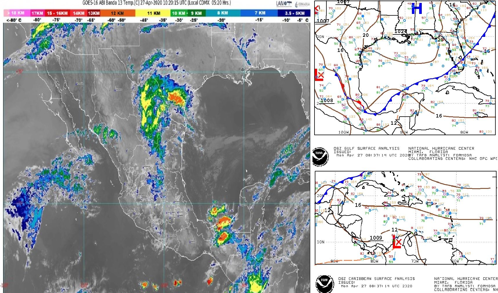 Golfo de México: Cielo nublado con lluvias puntuales fuertes en Veracruz (sur) e intervalos de chubascos en Tamaulipas (suroeste) y Tabasco (oeste y sur), todas acompañadas de descargas eléctricas, vientos arrachados y caída de granizo. Ambiente caluroso en el sur de la región. Viento de componente este de 15 a 30 km/h en la región, además de rachas de 50 a 60 km/h en Tamaulipas.