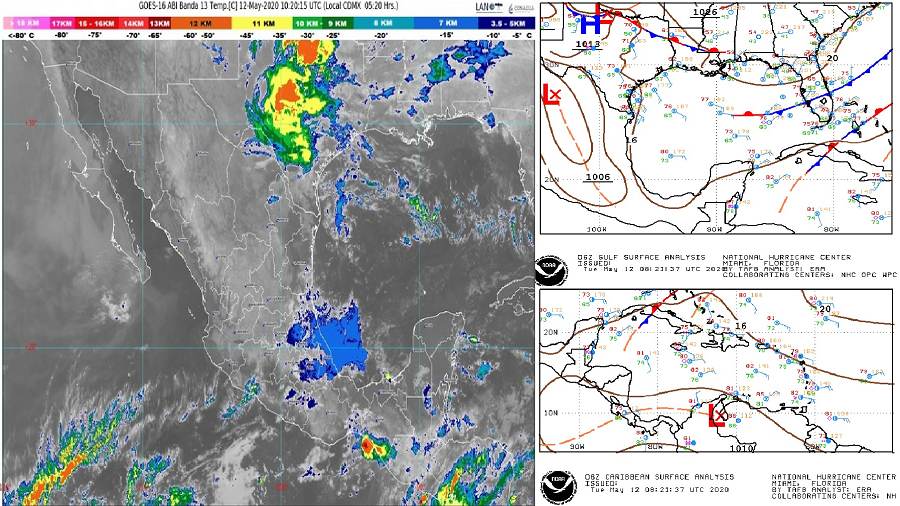 Canales de baja presión y el ingreso de humedad proveniente del Océano Pacifico, Golfo de México y Mar Caribe, ocasionarán lluvias en el oriente y sureste del territorio nacional, así como en la Península de Yucatán. Finalmente, se prevén temperaturas superiores a 40°C en zonas de Sonora, Sinaloa, Nayarit, Jalisco, Michoacán y Guerrero.