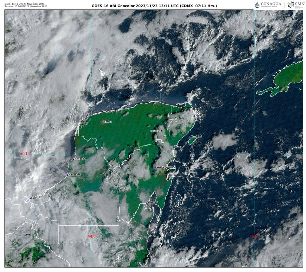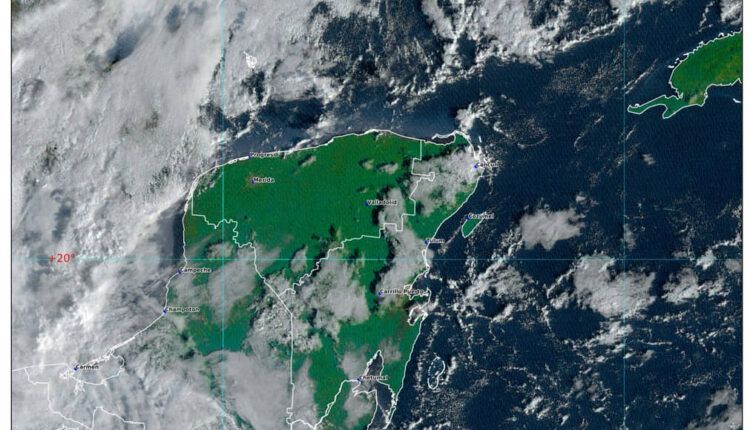 Cielo medio nublado a nublado con intervalos de chubascos en la región. Por la mañana, ambiente fresco y durante la tarde cálido a caluroso. Viento de dirección variable de 10 a 20 km/h con rachas de hasta 40 km/h en costas de Campeche y Yucatán.