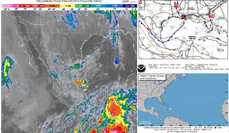 Península de Yucatán: Cielo parcialmente nublado por la mañana, desarrollo de nublados densos por la tarde y lluvias puntuales muy fuertes en Campeche, así como fuertes en Yucatán y Quintana Roo, todas con descargas eléctricas. Ambiente muy caluroso. Viento del este y noreste de 10 a 25 km/h con rachas de 50 a 60 km/h durante las tormentas.