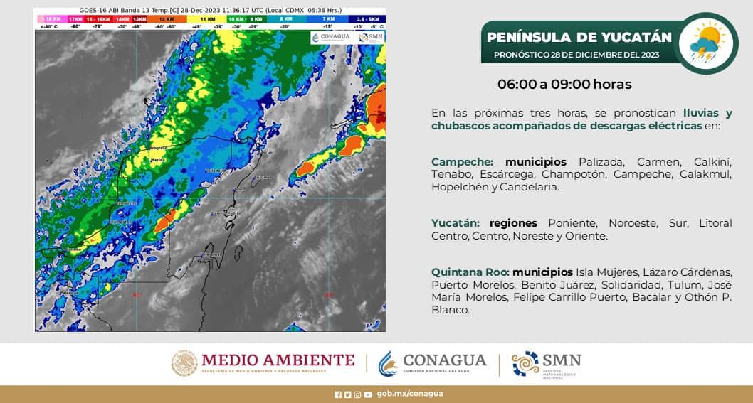 Cielo nublado durante el día con probabilidad de lluvias puntuales muy fuertes en Campeche y Quintana Roo, así como lluvias puntuales fuertes en Yucatán, las cuales podrían incrementar los niveles de ríos y arroyos, ocasionar deslaves, encharcamientos e inundaciones en zonas bajas. Ambiente fresco a templado durante la mañana y cálido por la tarde. Evento de “Norte” con rachas de 30 a 50 km/h y oleaje de 1 a 2 metros de altura en la región.
