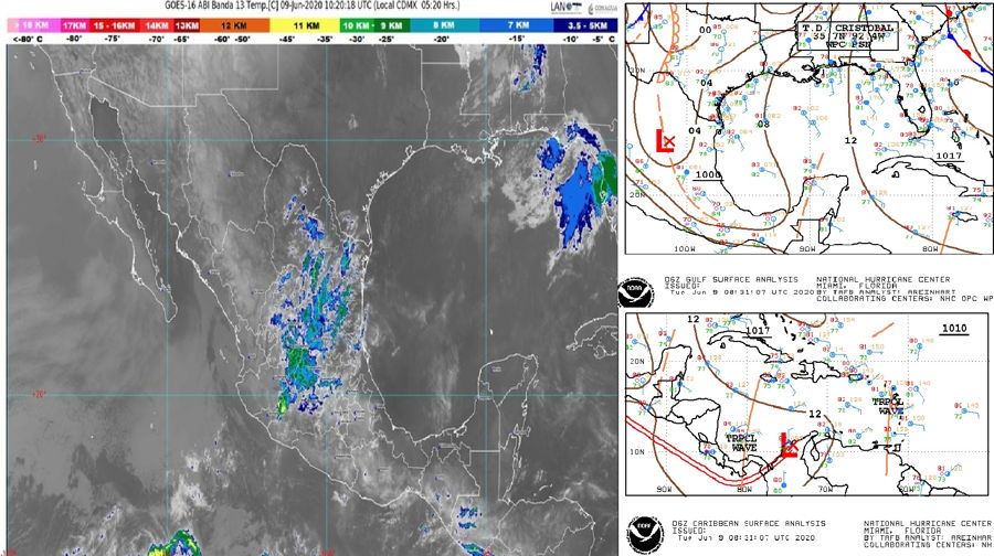 Golfo de México: Cielo parcialmente nublado por la mañana e incremento de nubosidad por la tarde con lluvias puntuales muy fuertes en Tamaulipas, fuertes en Tabasco e intervalos de chubascos en Veracruz, todas acompañadas de descargas eléctricas y posible caída de granizo. Ambiente cálido. Viento del este y sureste de 15 a 30 km/h en la región, con rachas superiores a 70 km//h y posible formación de torbellinos o tornados en Tamaulipas, así como rachas de 50 a 60 km/h en zonas de Veracruz.