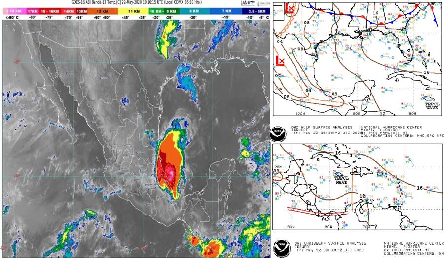 Por otra parte, canales de baja presión sobre el oriente y sureste del país, en interacción con la entrada de humedad del Océano Pacífico y Mar Caribe, ocasionarán lluvias fuertes a puntuales muy fuertes, actividad eléctrica, posibles granizadas y rachas de viento durante el paso de las tormentas, en dichas regiones, incluyendo la Península de Yucatán, además de intervalos de chubascos en el Valle de México.