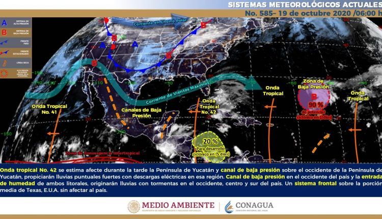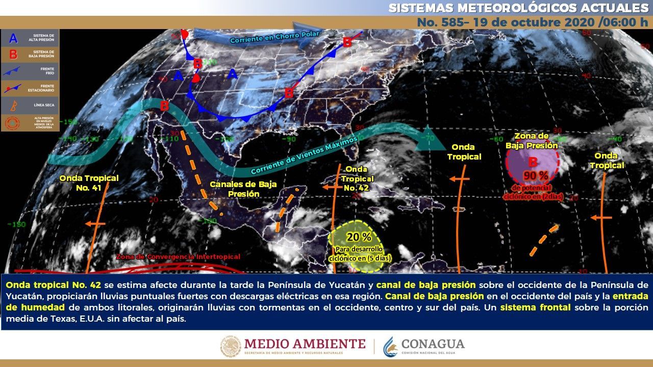 Para hoy, se pronostica que la onda tropical No. 42 se aproxime a la Península de Yucatán durante la tarde e interaccione con un canal de baja presión sobre el occidente de la Península. Esto ocasionarán lluvias puntuales fuertes con descargas eléctricas en esa región.