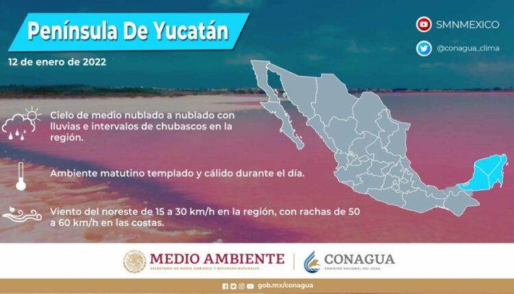 Península de Yucatán: Cielo medio nublado a nublado con lluvias e intervalos de chubascos en la región. Ambiente matutino templado y cálido durante el día. Viento del noreste de 15 a 30 km/h en la región, con rachas de 50 a 60 km/h en las costas.