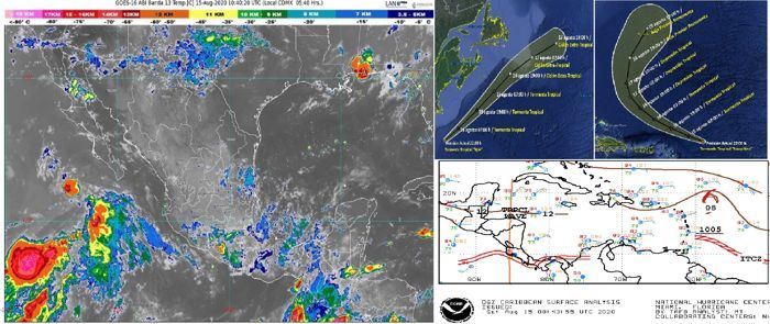 Península de Yucatán: cielo parcialmente nublado por la mañana, incremento de nublados durante la tarde, lluvias puntuales fuertes y descargas eléctricas en Campeche y Yucatán, así como chubascos en Quintana Roo. Ambiente cálido a caluroso y viento de componente este de 15 a 30 km/h.