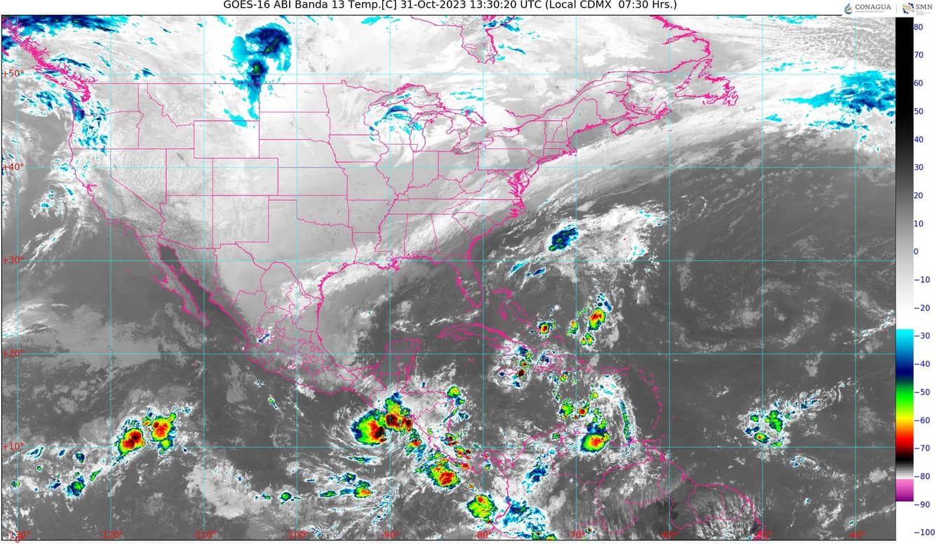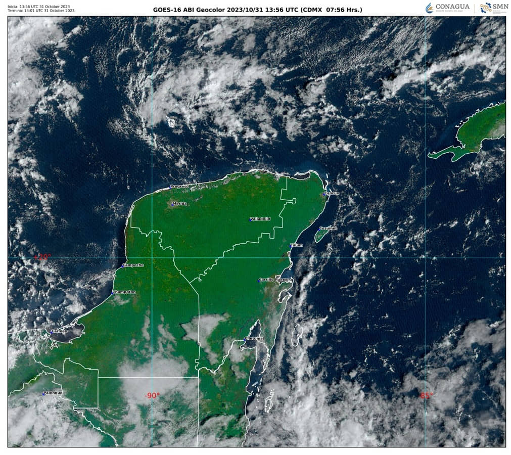 Cielo medio nublado durante la mañana y nublado por la tarde y noche, con lluvias puntuales intensas en Campeche, y muy fuertes en Yucatán y Quintana Roo. Ambiente cálido por la mañana y caluroso durante la tarde. Evento de “Norte” con rachas de 50 a 70 km/h y oleaje de 1 a 3 metros de altura y posible formación de trombas marinas en las costas de Campeche y Yucatán.