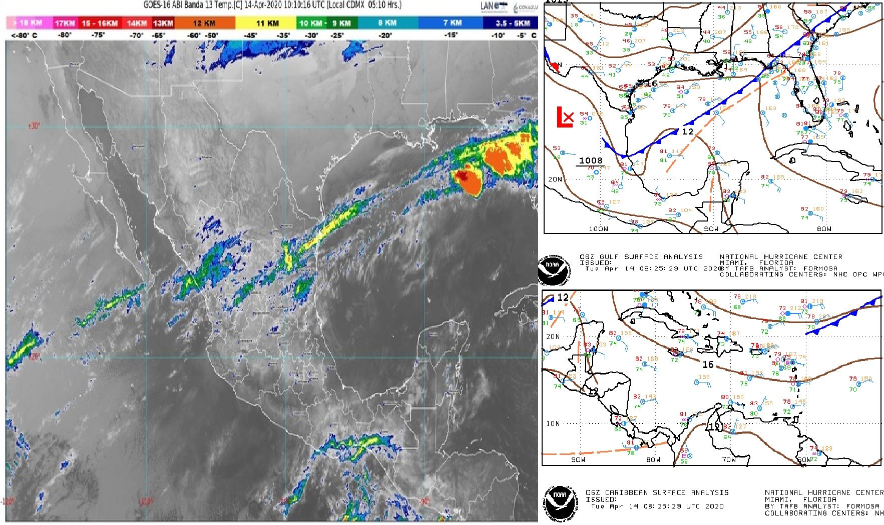 Para hoy MARTES-14-ABR, el frente No. 52 se extenderá desde el Golfo de México hasta el noreste del territorio nacional. En su desplazamiento hacia el sureste, ocasionará incremento en el potencial de lluvias puntuales fuertes en Veracruz y chubascos acompañados de descargas eléctricas y granizadas sobre Coahuila, Nuevo León, San Luis Potosí, Tamaulipas, Puebla, Oaxaca y Chiapas.