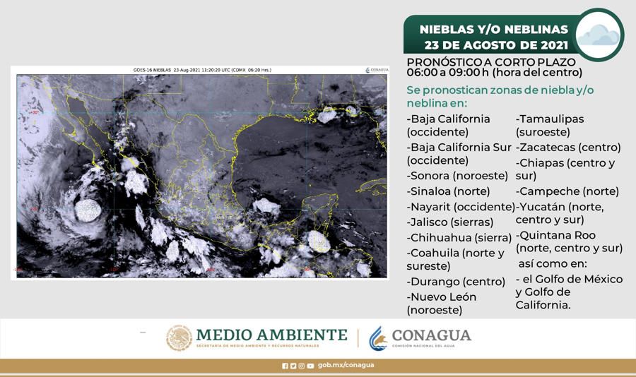 Para hoy, se pronostican lluvias puntuales intensas (de 75 a 150 milímetros [mm]) en sitios de Chiapas, Oaxaca y Veracruz; muy fuertes (de 50 a 75 mm) en áreas de Colima, Guerrero, Jalisco, Michoacán, Puebla y Tabasco; fuertes (de 25 a 50 mm) en regiones de Campeche, Baja California Sur, Nayarit, Quintana Roo, Sinaloa, Sonora y Yucatán; intervalos de chubascos (de 5.1 a 25 mm) en localidades de Chihuahua, Ciudad de México, Durango, Estado de México, Guanajuato, Hidalgo, Morelos y Tlaxcala, así como lluvias aisladas (de 0.1 a 5 mm) en zonas de Nuevo León, Querétaro, San Luis Potosí y Tamaulipas.