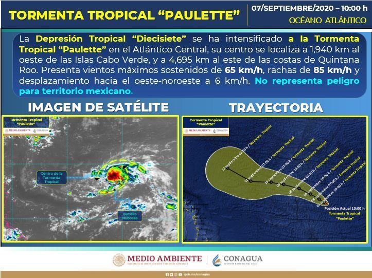 Por su parte, la Comisión Nacional del Agua (Conagua) informó que el centro de Paulette se localiza a 4,695 kilómetros al este de las costas de Quintana Roo y no representa peligro para #México.