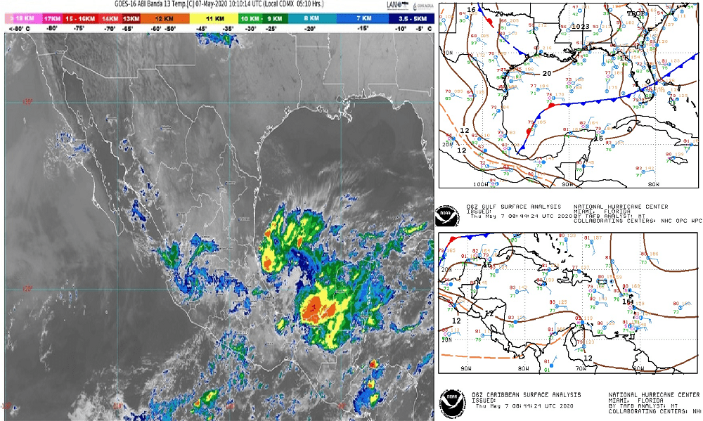 Este día, el frente No. 59 originará lluvias fuertes a puntuales intensas acompañadas de descargas eléctricas, granizadas y rachas fuertes de viento en el sur y sureste del país, además de la Península de Yucatán. Así mismo, un canal de baja presión sobre el interior del territorio nacional, en combinación con inestabilidad atmosférica superior, ocasionarán chubascos y lluvias fuertes a puntuales muy fuertes acompañadas de descargas eléctricas, granizadas y rachas de viento de 40 a 50 km/h durante las tormentas en zonas del noroeste, occidente y centro de la República Mexicana, incluido el Valle de México. Una línea seca provocará rachas de viento superiores a 50 km/h así como intervalos de chubascos acompañados de descargas eléctricas en Coahuila, Nuevo León y Tamaulipas. Un sistema de alta presión en niveles medios de la atmósfera mantendrá la onda de calor con temperaturas superiores a 35°C en 18 entidades del noroeste, occidente, sur y sureste del país, incluida la Península de Yucatán.