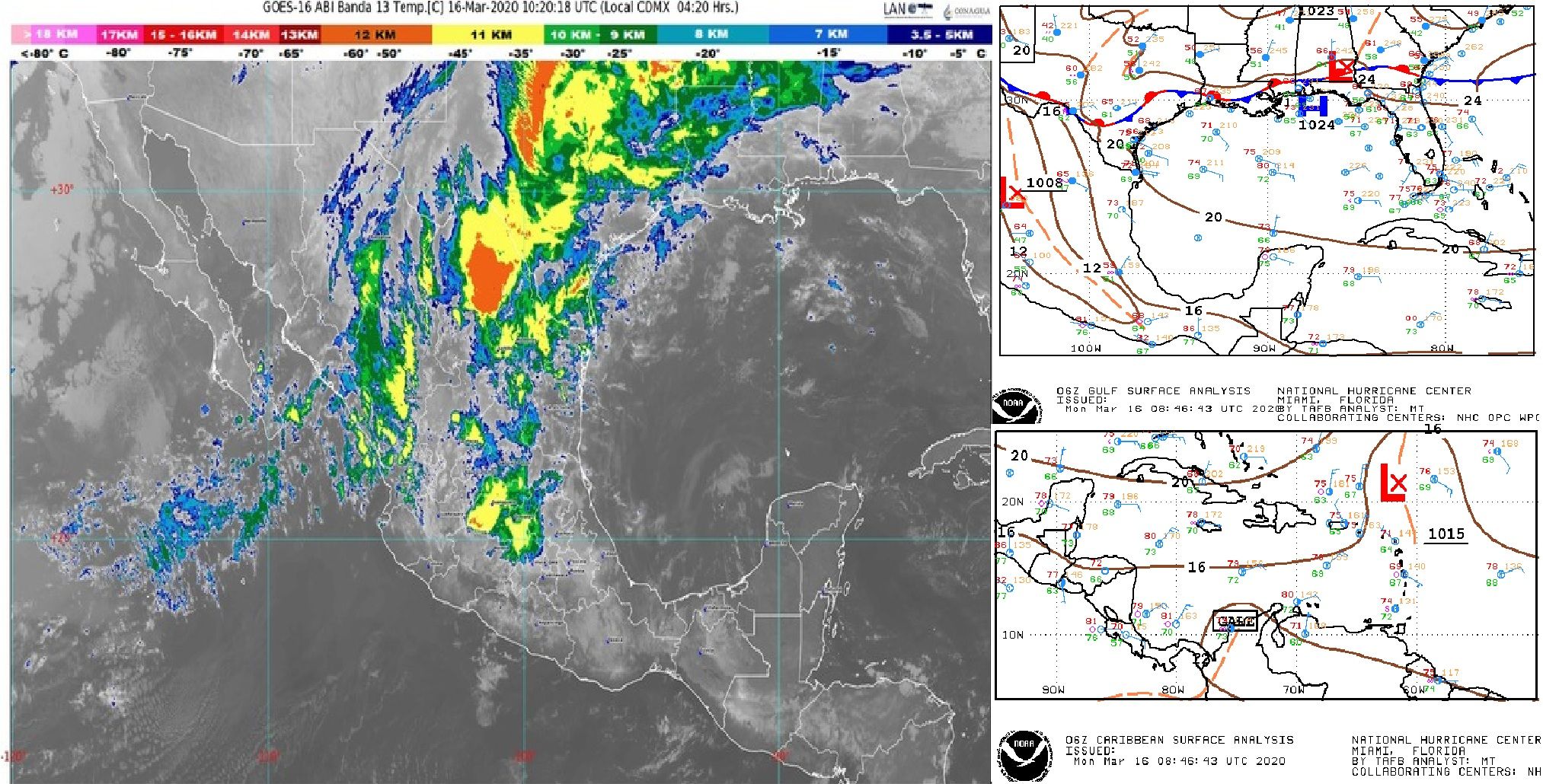Este día, una línea seca se establecerá sobre el norte de México, originando rachas de viento de 50 km/h y lluvias acompañadas de descargas eléctricas en dicha región; en tanto que un canal de baja presión se extenderá sobre el interior del país, generando nublados densos con chubascos vespertinos, descargas eléctricas y posible caída de granizo.
