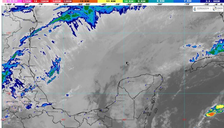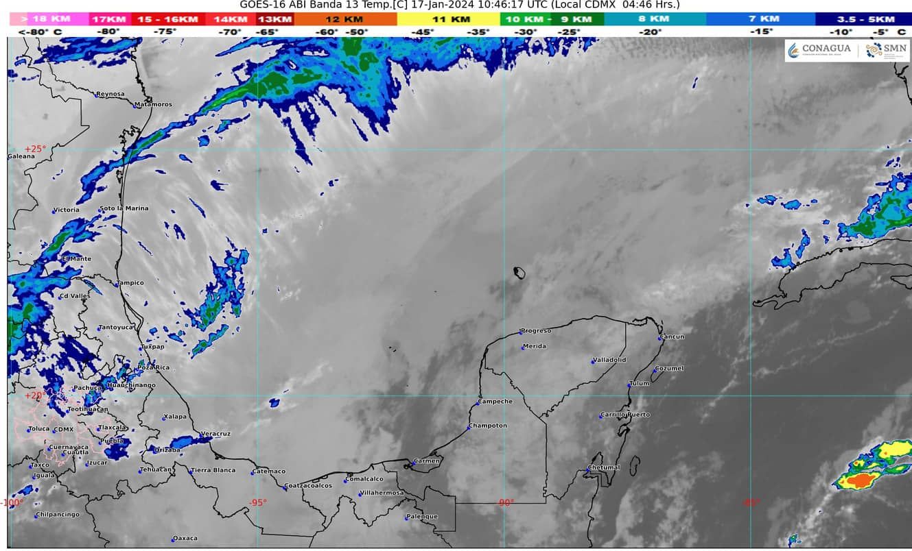 Península de Yucatán: Cielo medio nublado a nublado, con lluvias puntuales fuertes en la región. Ambiente fresco a templado al amanecer y cálido por la tarde. Por la mañana, evento de “Norte” con rachas de 50 a 70 km/h y oleaje de 1 a 3 metros de altura en costas de la región.