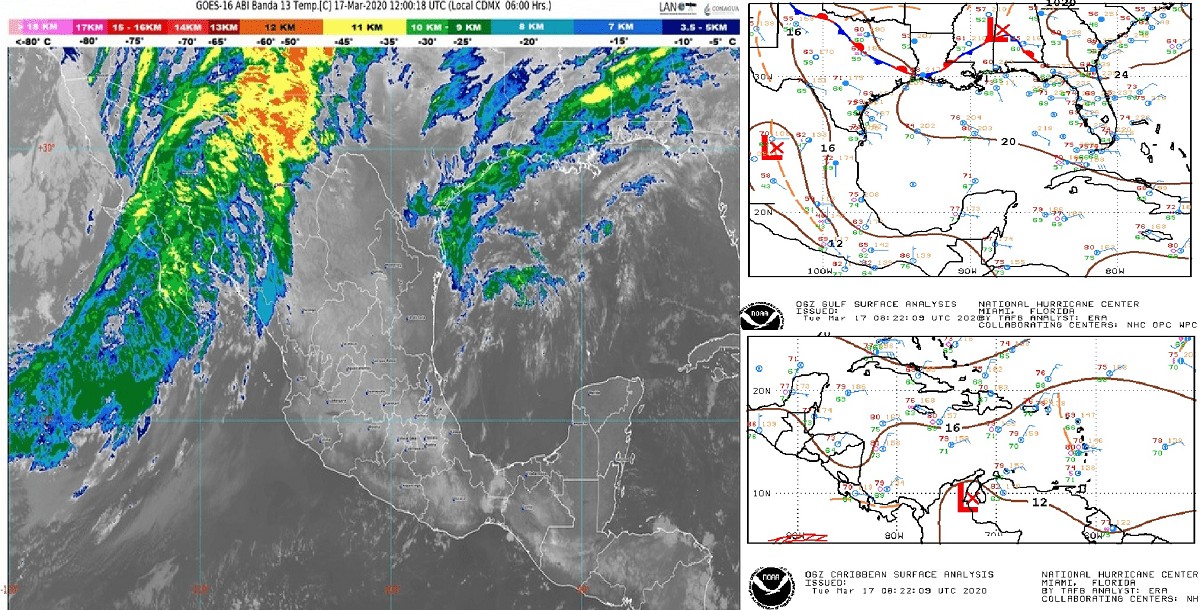 Un canal de baja presión se extenderá sobre el interior del país, aunado a la entrada de humedad del Océano Pacífico y Golfo de México, ocasionará lluvias con intervalos de chubascos acompañados de descargas eléctricas y posibles granizadas sobre los estados del occidente y centro del territorio nacional, un segundo canal de baja presión se extenderá sobre el sureste del país, provocando chubascos con tormentas eléctricas en dicha región.