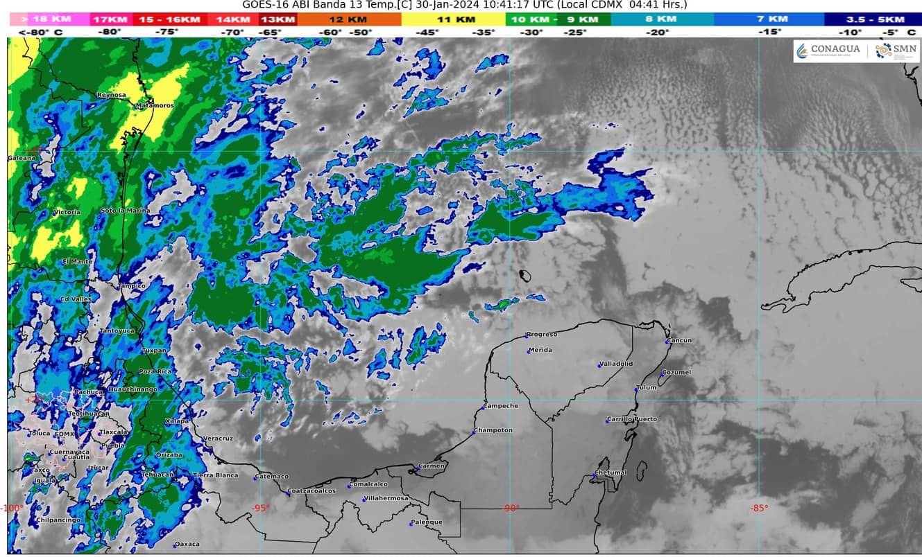 Cielo medio nublado a nublado la mayor parte del día. Por la mañana, ambiente templado a fresco. Bancos de nieblas y posibles heladas, con ambiente frío en zonas altas de Tamaulipas y muy frío en zonas montañosas de Veracruz. Por la tarde, cielo nublado y ambiente templado a cálido en Tamaulipas y Veracruz. Chubascos en Veracruz, lluvias aisladas en Tabasco y sin lluvia en Tamaulipas. Viento de componente este de 10 a 20 km/h con rachas de 30 km/h.