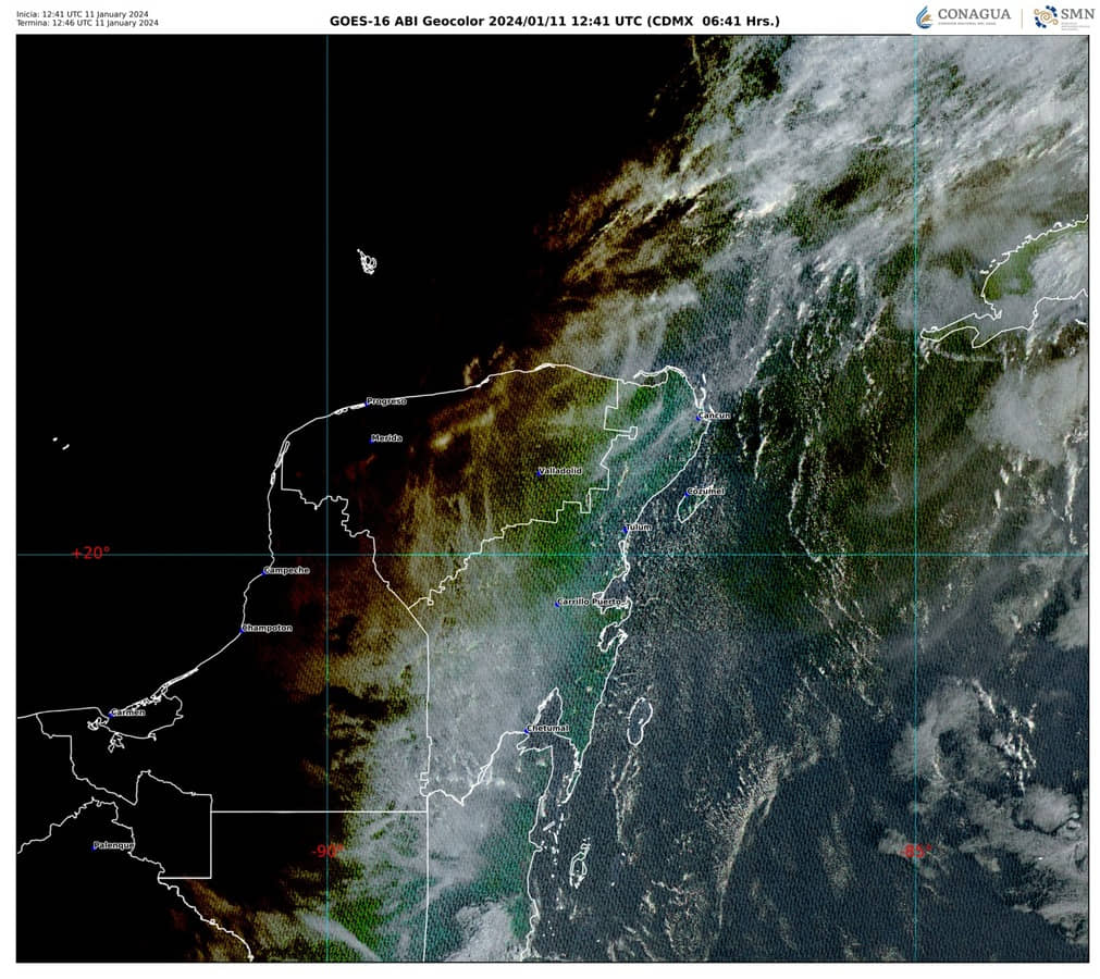 Cielo medio nublado con lluvias aisladas en zonas de Quintana Roo y sin lluvia en el resto de la región. Ambiente templado al amanecer y cálido por la tarde, siendo caluroso en zonas de Campeche y Yucatán. Viento del sur y sureste con rachas de 40 a 60 km/h en costas de Yucatán y Quintana Roo.