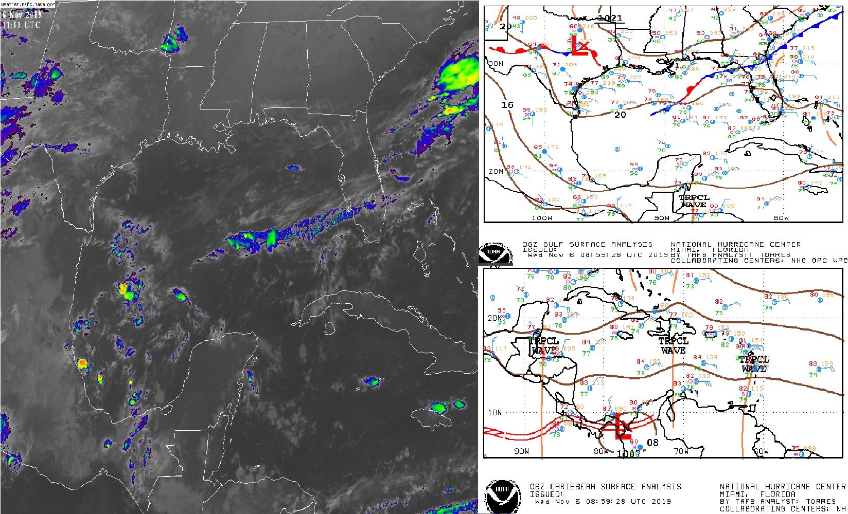 2.- La Onda Tropical No. 50 (seca)del Mar Caribe se localizadas en superficie desde el Golfo de Honduras y más al sur en el Océano Pacifico, se mueve al sureste, genera cielo nublado con lluvias y posibilidad de chubascos ocasionales en su área de influencia, por la tarde afectara la porción sur del estado de Quintana Roo., la otra Onda Tropical localizada en superficie en el Occidente de Republica Dominicana hasta el occidente de Venezuela y una tercera se Localiza sobre las Antillas Menores; se mueven al suroeste provocan nubosidad y lluvias sobre su área de influencia; no presentan condiciones favorables de evolucionar en un sistema tropical, según información del centro nacional de huracanes de Miami, Florida, E.U.A.