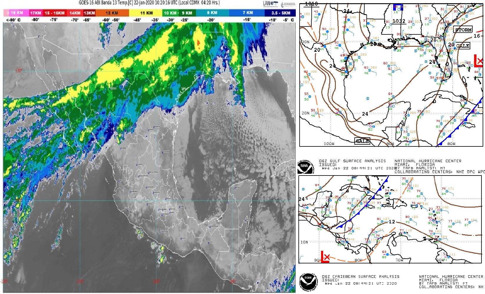 En el Golfo de México, durante la mañana se prevén bancos de niebla en zonas montañosas,cielo medio nublado, ambiente templado y viento del sur de 15 a 30 km/h.