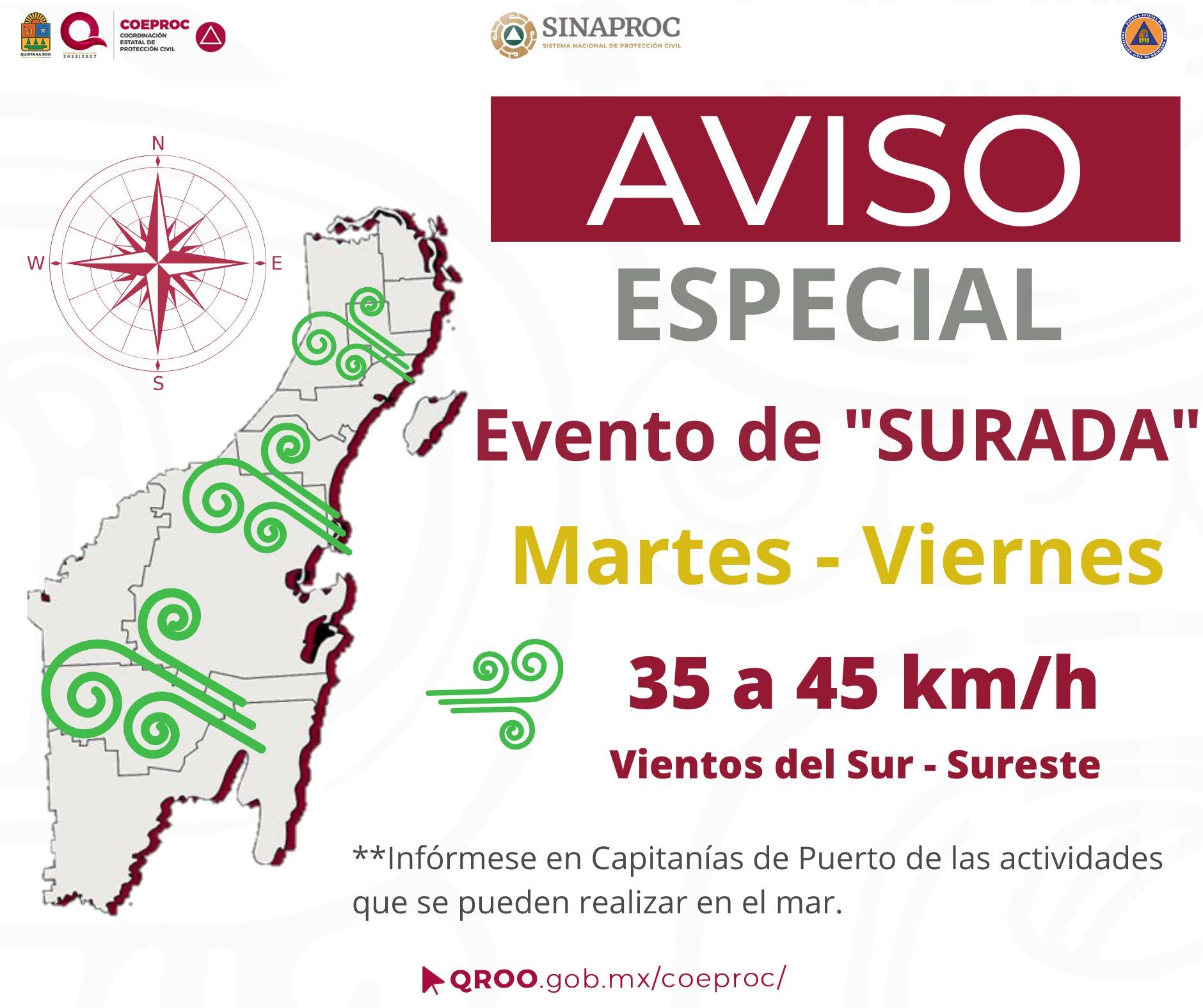 Durante el transcurso de la semana; a partir del día de hoy martes, miércoles, jueves y viernes se estará presentando evento de “Surada” con vientos principalmente del sur y sureste de 35 a 45 km/h y rachas más fuertes, sobre las zonas de costa del Estado, perdiendo intensidad durante el día sábado.