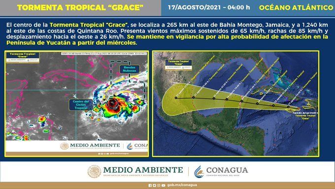 #TormentaTropical #Grace: Se mantiene en vigilancia por alta probabilidad de afectación en la península de #Yucatán a partir del miércoles.