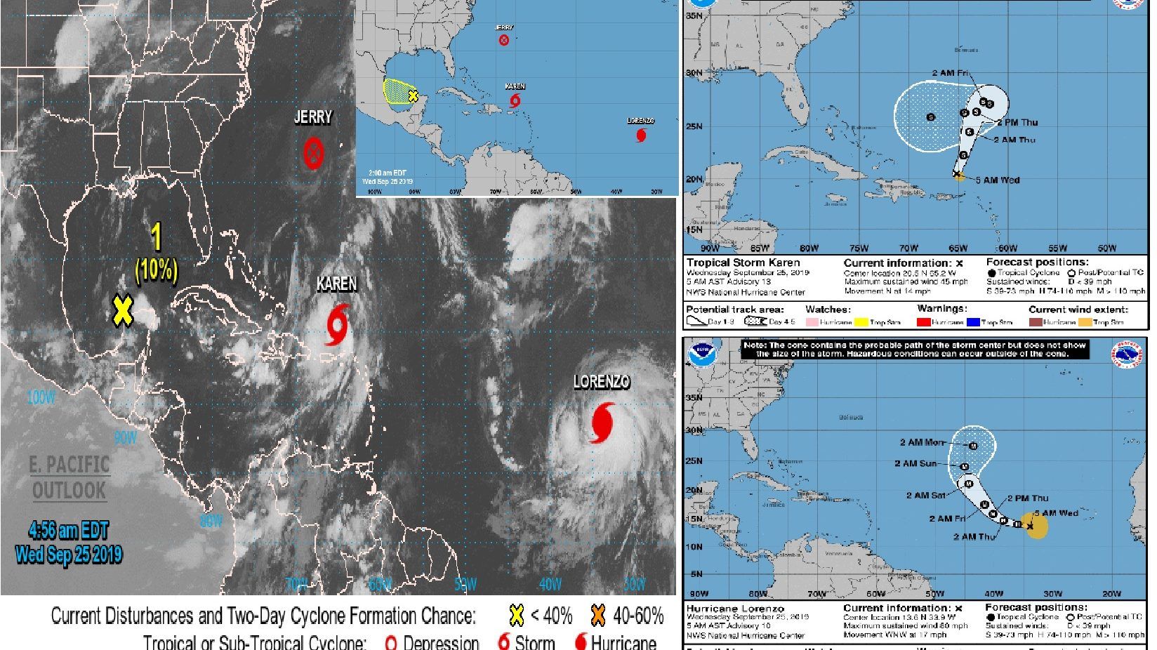 2.- La Tormenta Tropical “KAREN”, del Océano Atlántico; se localiza las 05:00 horas el día de hoy, en las coordenadas 20.5° grados latitud norte y 65.2° longitud oeste, aproximadamente a 160 kms., al nor-noreste de San Juan de Puerto Rico, se mueve al norte (360° grados) a razón de 22 kph, con vientos máximos cerca del centro de 75 kph, por su lejanía y dirección de movimiento no representan ningún riesgo para las costas nacionales, se le da seguimiento.