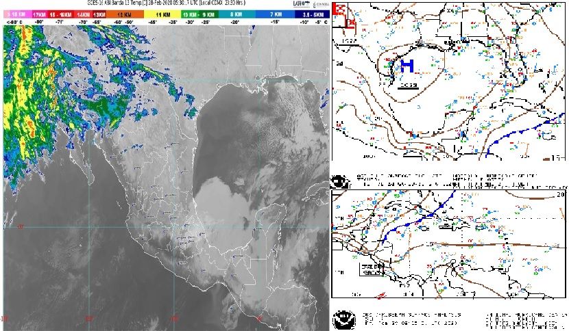 Golfo de México: Cielo despejado en Tamaulipas y nublado con lluvias y chubascos en Veracruz y Tabasco. Ambiente frío con nieblas matutinas en zonas montañosas. Viento del noreste de 10 a 25 km/h en la región, con rachas de 50 km/h en Veracruz (sur) y Tabasco.
