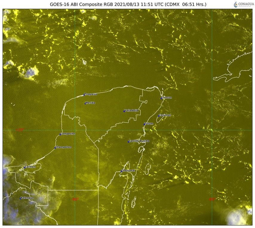 Península de Yucatán: Cielo despejado por la mañana y nublado por la tarde con intervalos de chubascos y descargas eléctricas. Ambiente templado a cálido por la mañana y caluroso por la tarde. Viento del este de 20 a 30 km/h.
