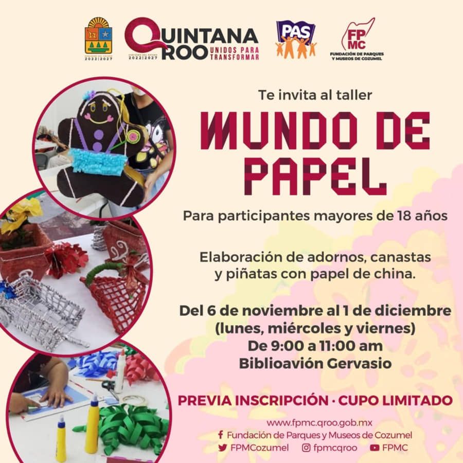 Cozumel, Quintana Roo; 2 de noviembre de 2023.- Con el objetivo de promover el desarrollo de habilidades artísticas y emprendedoras, la Fundación de Parques y Museos de Cozumel (FPMC) invita a personas mayores de 18 años de edad a participar en el taller gratuito “Mundo de Papel”, que se llevará a cabo el próximo lunes y hasta el 1 de diciembre, en el BiblioAvión Gervasio.