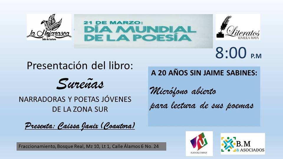 Dentro del marco del Día mundial de la poesía proclamado por la UNESCO en 1999, se llevará a cabo la presentación del libro “Sureñas” narradoras y poetas de la zona sur, que se llevará a cabo este jueves 21 de marzo de 9 a 10 pm en la sala de lecturas “La Hojarasca”, donde también habrá micrófono abierto para la lectura de poemas del escritor chiapaneco Jaime Sabines.