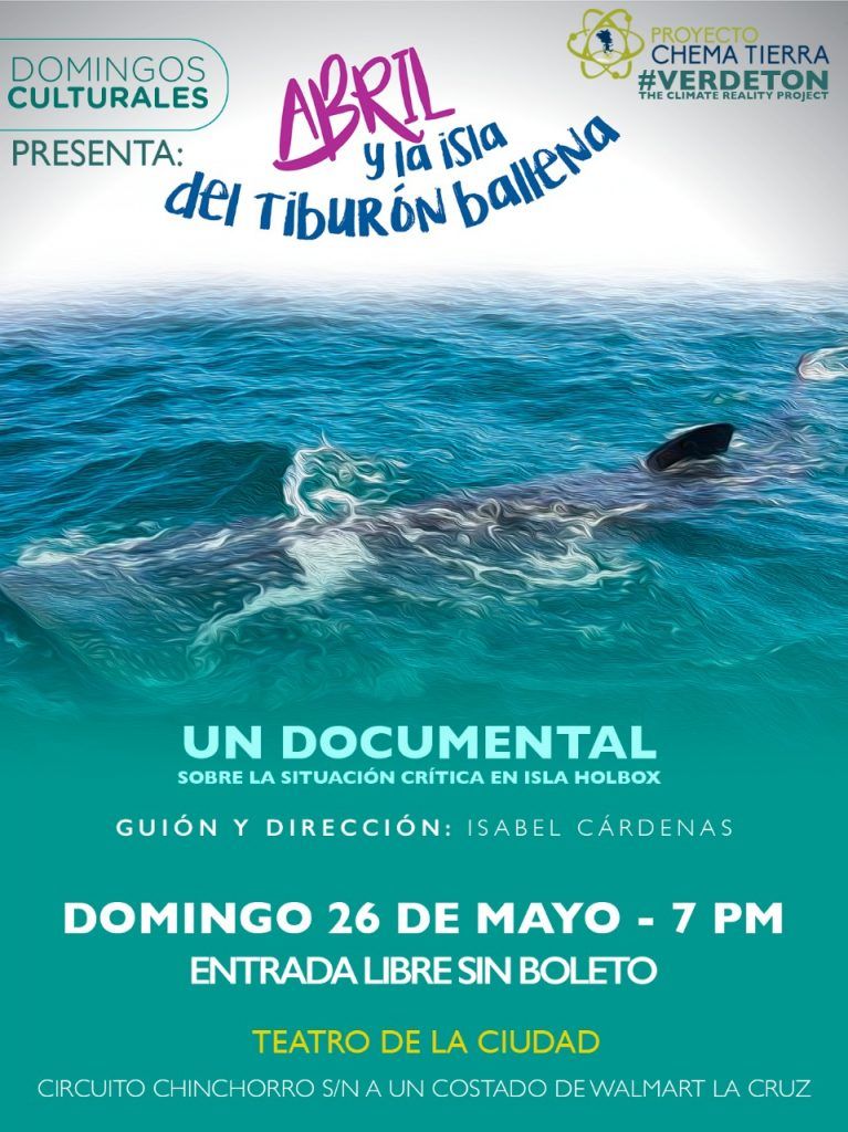19:00 horas – Domingo Cultural en el Teatro de la Ciudad presenta la proyección de: “Abril y la Isla del Tiburón Ballena”, Documental sobre la situación ecológica de Isla Holbox. Teatro de la Ciudad. Entrada libre sin boleto.