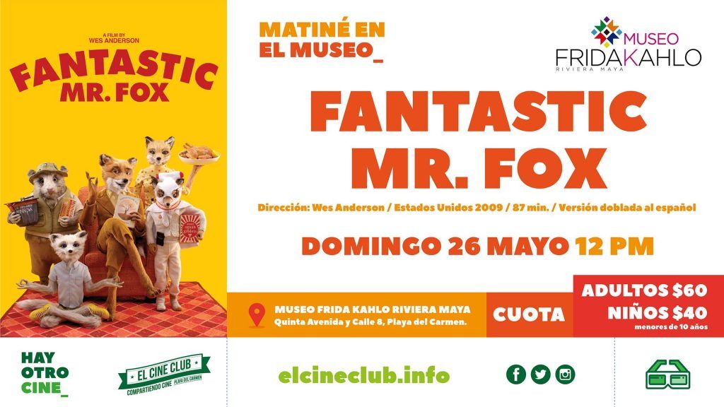 12:00 horas – El Cineclub presenta Matiné en el Museo, con la película “Fantastic Mr Fox”, (USA, 2009). Museo Frida Kahlo Riviera Maya. Cuota adultos $60 pesos, niños $40 pesos.