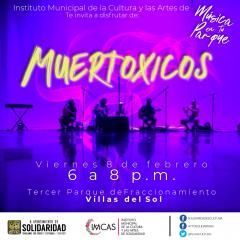 18:00 a 20:00 horas – Música en tu Parque presenta concierto con: “Muertóxicos”. Tercer Parque del Fracc. Villas del Sol. Coordinado por Instituto Municipal de la Cultura y las Artes de Solidaridad. Entrada libre.