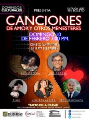 19:00 horas – Domingo Cultural en el Teatro de la Ciudad presenta: “Canciones de Amor y otros Menesteres” Concierto con Cantautores de Playa del Carmen como: Luis García, Luis Ortega, Violeta Varela, Pepe Menchaca y Elhé. Coordinado por IMCAS. Teatro de la Ciudad. Entrada libre.